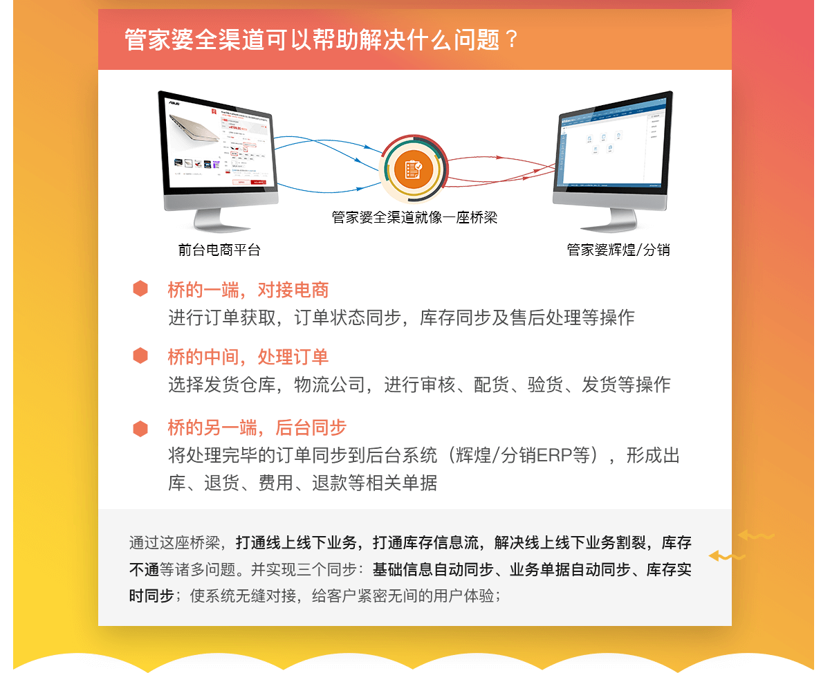 是一个专业的电商业务管理系统,既可以对接电商平台,处理电商发货业务,又可以深度对接管家婆进销存软件,使线上线下业务紧密结合,协同互补,助力传统企业开展电商全渠道业务。